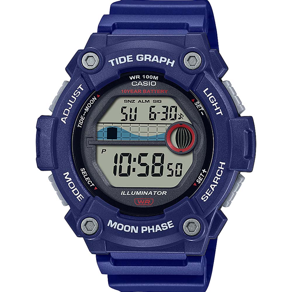 This is the Casio Tide Graph Blue Men's Watch WS1300H 2A. The Casio Tide Graph Blue Men's Watch WS1300H 2A starts with a durable black resin exterior design, 100 meter water resistance, and 10 year battery life. Then add on board tide graph, moon data, and LED light ensuring an easy read even in the dark, to deliver everything a water sports enthusiast needs, right at your fingertips.